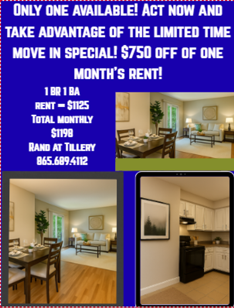 Limited time Move in Special -take $750 off of first month's rent!